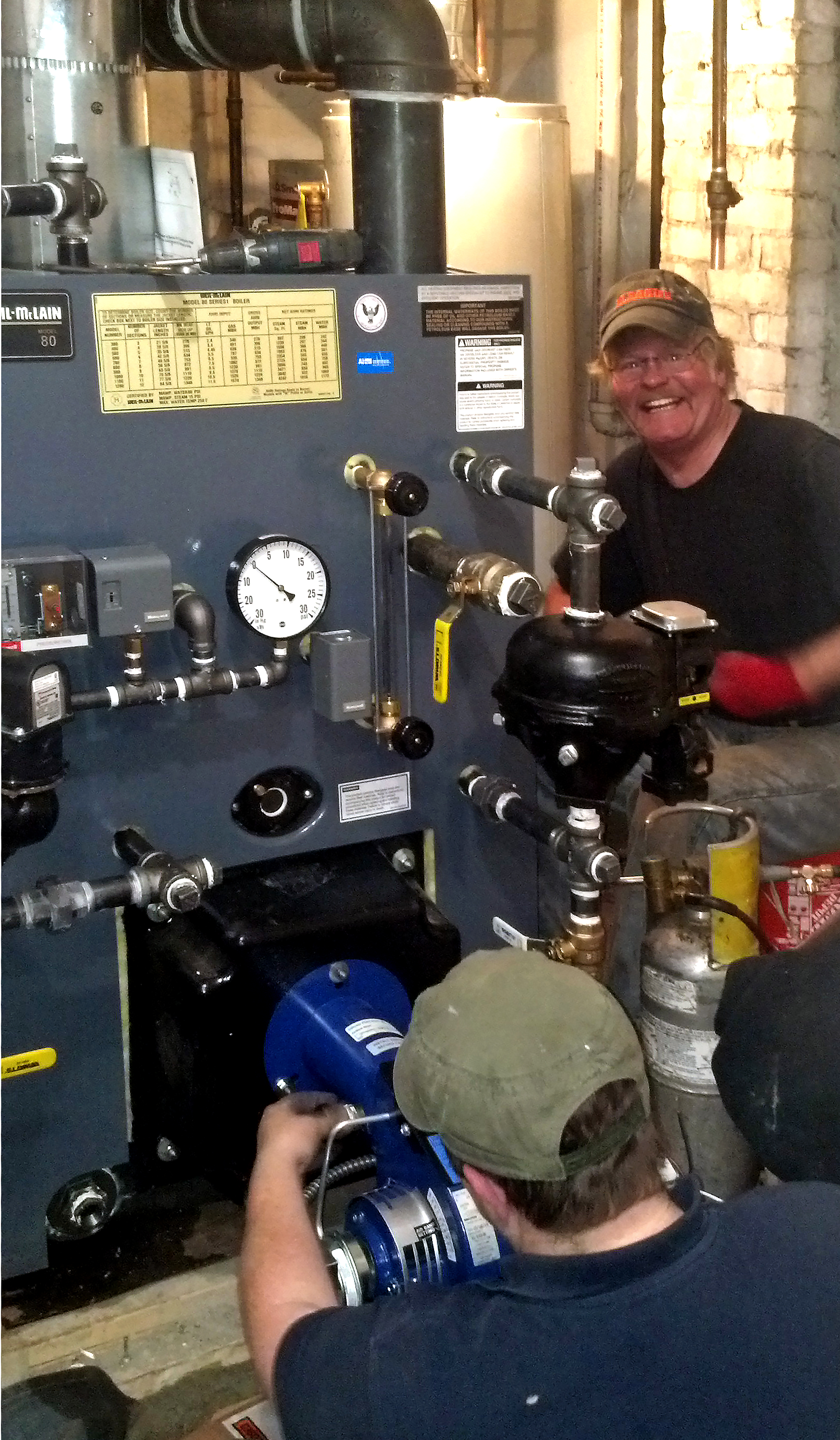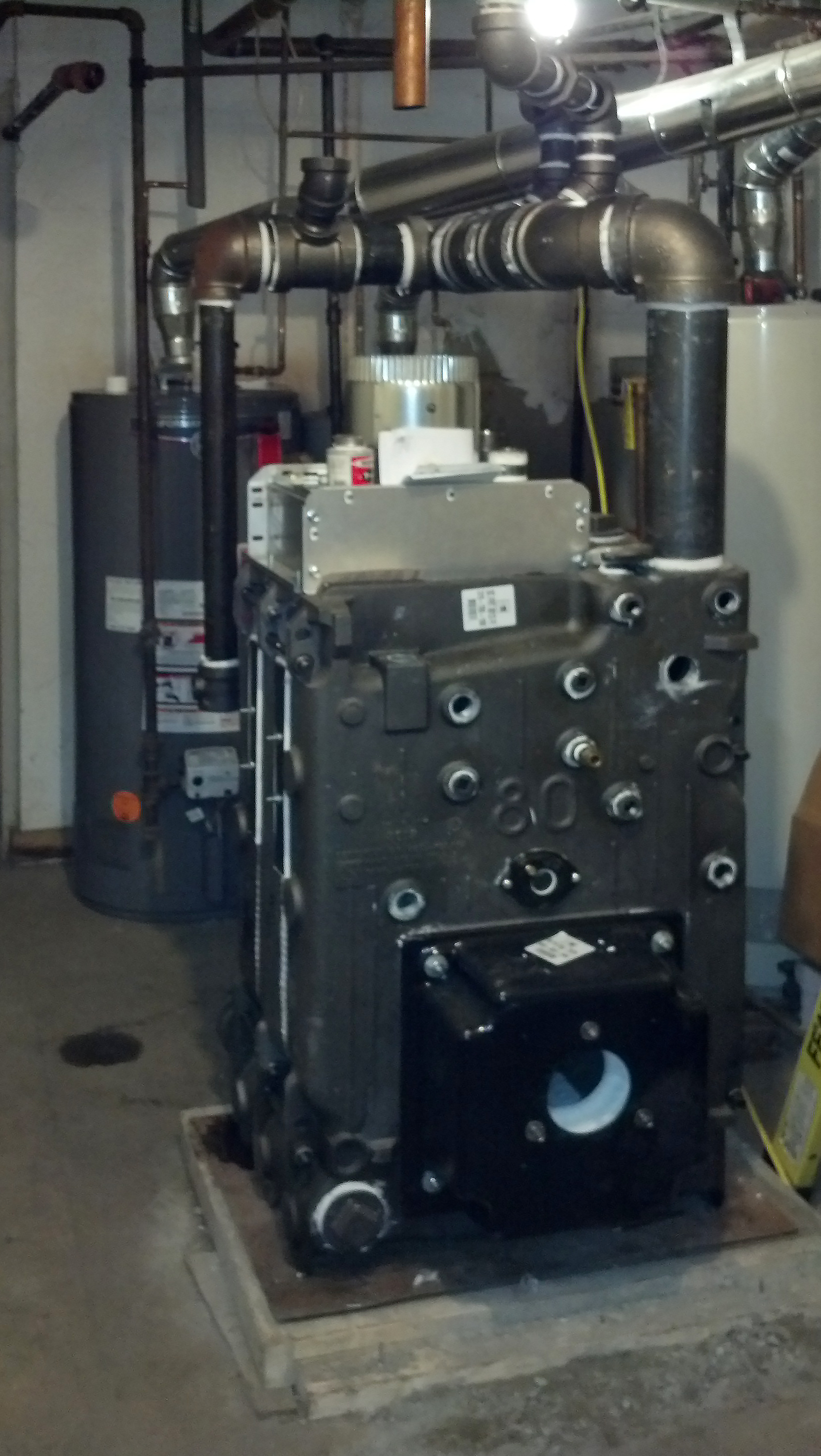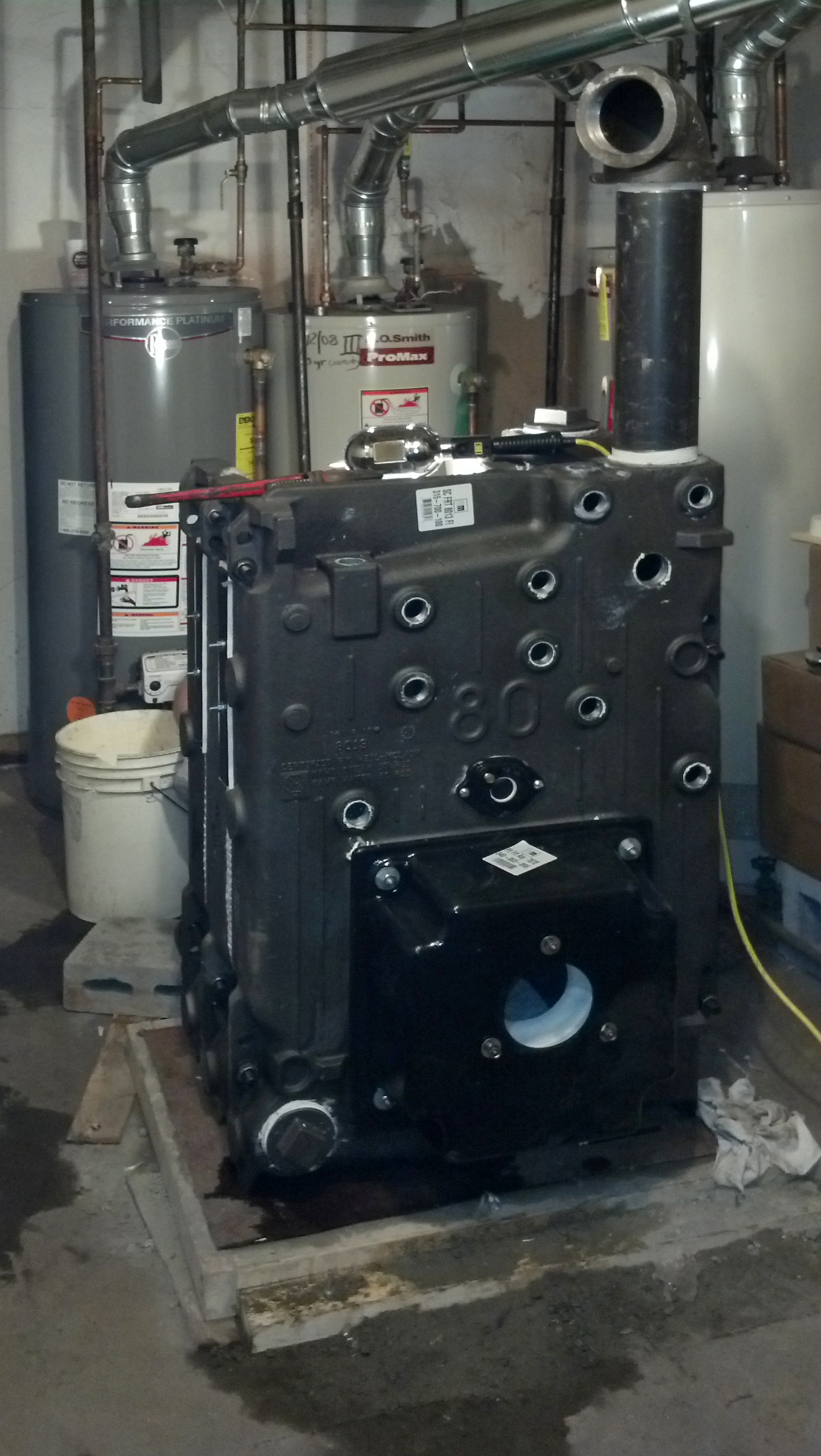The brownstone building needed a new steam boiler to replace the scary, leaky old one. After calculating the connected load of pipes and radiators, we selected a commercial type boiler with large sections that could accommodate a large pipe diameter header. We disconnected the old number and waved as it went out the door, to be recycled. Our multi-talented and -muscled demo team brought the heavy new boiler sections into the building and set them out of the way for us at the same time.